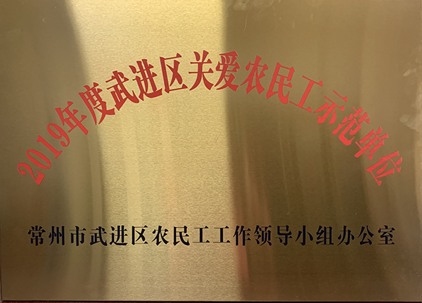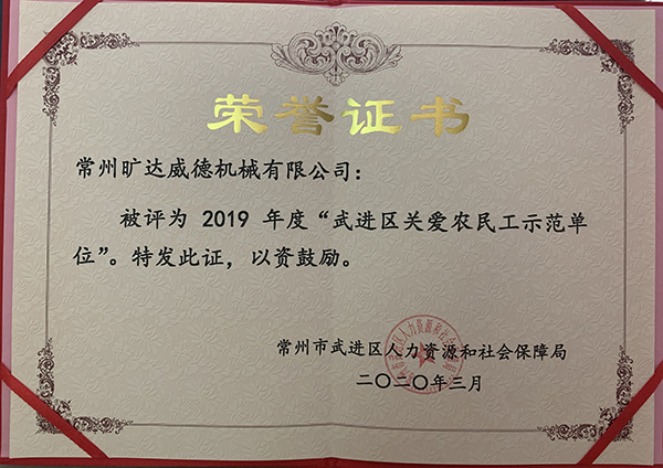 近日,常州曠達(dá)威德機(jī)械有限公司榮獲2019年度“武進(jìn)區(qū)關(guān)愛(ài)農(nóng)民工示范單位”榮譽(yù)稱(chēng)號(hào)。